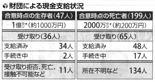 そして、合意時点での生存者には1億ウォン(約1,000万円)を支給、死亡者の遺族には2,000万ウォン(約200万円)を支給することになりました。