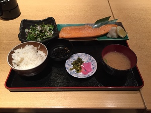私は、地魚定食(極)1,280円を注文しました。地魚はその日によって変わるみたいで、昨日は鮭のハラスで、脂が乗っていて、結構食べ応えがありました。この鮭のハラスに、ご飯、味噌汁、生野菜、ひじき、漬け物がつき、6品で定食になっています。