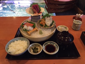 今回は、ランチで「刺身定食・限定10食・1,000円」を注文しました。大きめのエビ1尾、マグロ、ハマチ、タイ、カツオ、ホタテ、タコ、イカなどの厚切り刺身が1~3切れ、約10種類の刺身がこの値段で食べられますので、コストパフォーマンスが抜群によいと思いました。