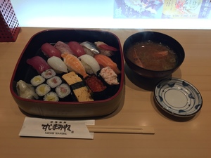 私は、板前さんの真ん前のカウンターの席につき板前さんとおしゃべり、この店で「1.5人前」と呼ばれている「13貫+巻物、特盛にぎり」を注文しました。昼はテーブルの方から埋まりますので、板前さんが3人いる長いカウンターには私ひとりだけでした。