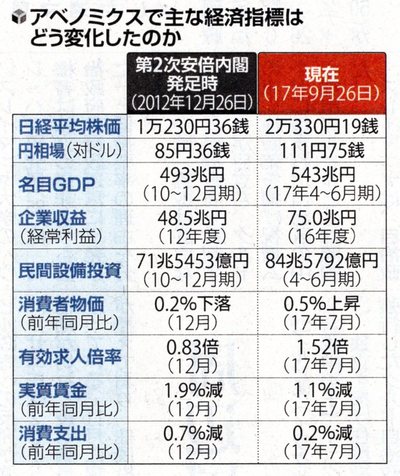 ※添付画像は、2017年9月27日 読売新聞に掲載された「主な経済指標の5年間での変化」です。