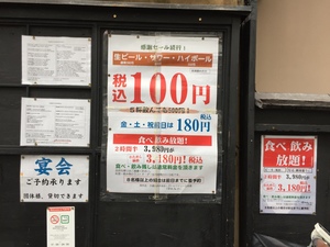 店の前にはチラシが数枚貼られていて、そこには「感謝セール続行、生ビールが税込み100円!ただし、金、土、祝前日は180円、食べ飲み放題、2時間半、3,980円のところ、お試し価格3,180円!税込み、ただし、食べ残し、飲み残しの場合、通常料金をいただきます」と書かれていました。
